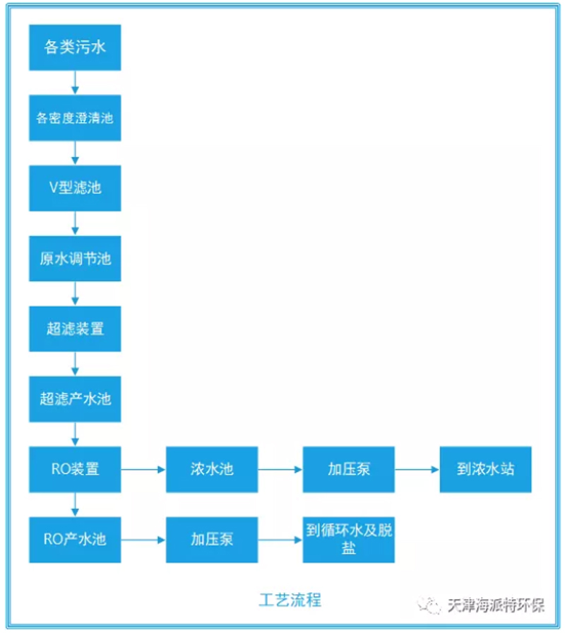 該項(xiàng)目處理水量是12500T/D,出水標(biāo)準(zhǔn)為中水回用水質(zhì)標(biāo)準(zhǔn)。整個(gè)項(xiàng)目采用以下工藝,天津海派特主要負(fù)責(zé)中水回用裝置界區(qū)超濾工藝設(shè)備、管道、電氣、儀控等工程設(shè)計(jì)、制造、供貨、安裝、調(diào)試工作。